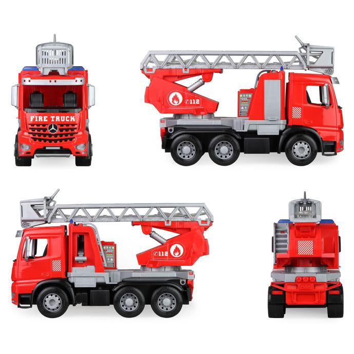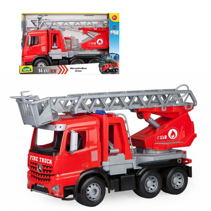 Oduševite svog malog vatrogasca ovim LENA, Worxx, vatrogasnim vozilom sa mnoštvom zabavnih značajki. Izvrsna replika originalnog vozila Mercedes Arocs. Opremljen je integriranim spremnikom za vodu tako da može gasiti požar sa sigurne udaljenosti od otprilike tri metra. Također uključuje ljestve za spašavanje koje se mogu rotirati oko svoje osi. Izdržljivost igračke u zahtjevnim situacijama i uzbudljivim avanturama povećavaju trostruke osovine. Vatrogasno vozilo MB Arocs predstavlja odličan poklon za svu djecu od tri godine naviše koja uživaju u zabavi sa puno akcije.