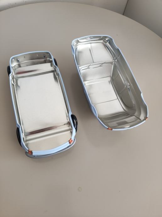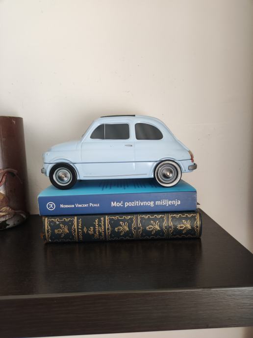 Prodajem limeni autić / kutija za kekse, Fiat 500, sa originalnim kotačima. Dimenzije 21 x 9,4 x 9,2. Veličina vidljiva na slici u odnosu na knjigu.