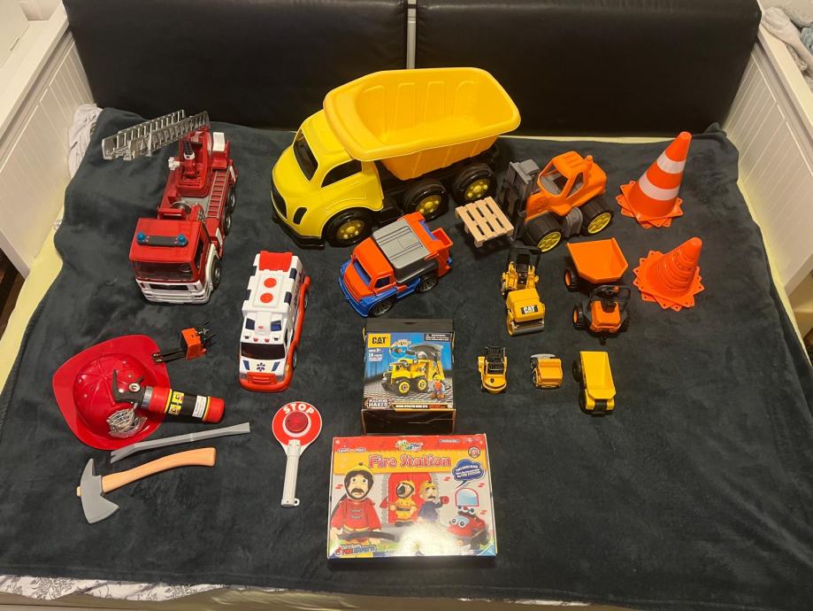 Veliki lot igračaka za dečka: bageri, viličari, vatrogasci, hitna pomoć, smetlarski kamion, 2 seta po 4 čunja, CAT set za slaganje, set za malog vatrogasca, palica policijska, plastelin set (neotvoreno).