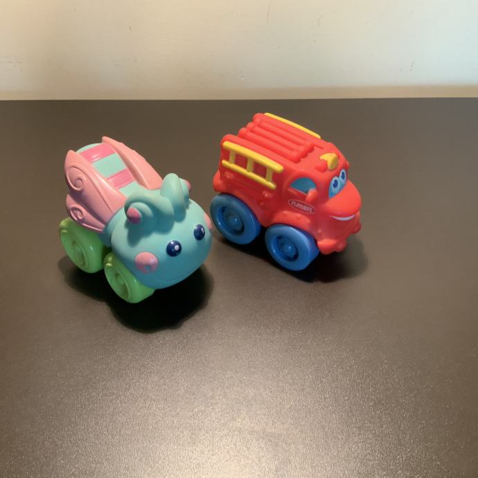 Prodajem Playskool dva autića. Autići su čvrsti i kompaktni dužine 10 cm. Jedan od autića ima pošaranu donju stranu.