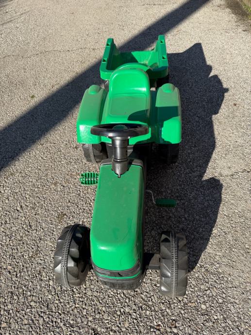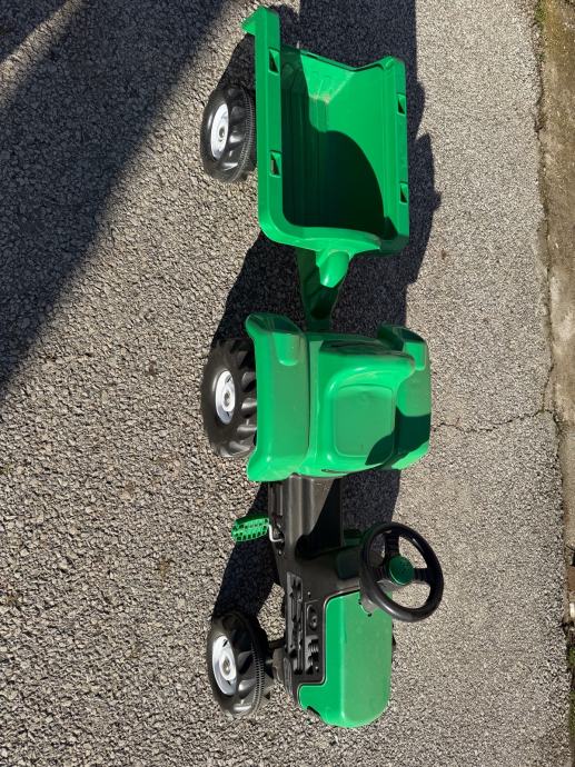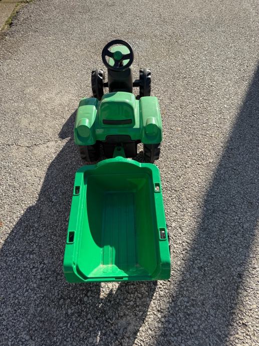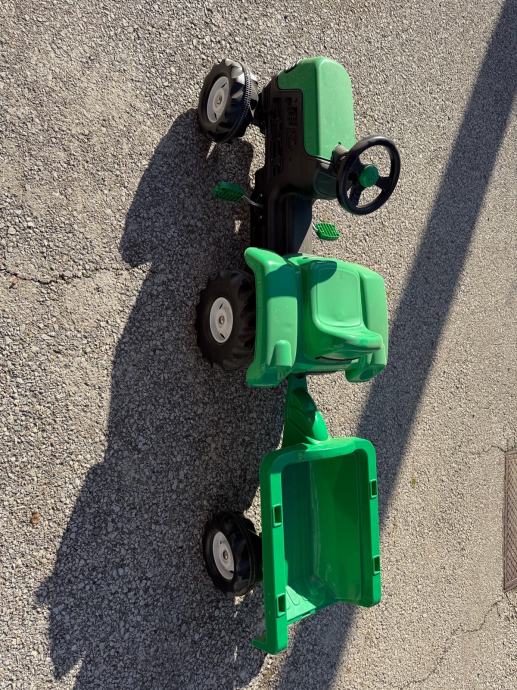 Prodajem dječji traktor na pedale u zelenoj boji s odvojivom prikolicom. Traktor ima funkcionalan volan, udobno sjedalo i stabilne gumene kotače koji omogućuju vožnju po različitim površinama. Prikolica se lako spaja i odspaja, što djeci pruža dodatnu zabavu pri prevozu igračaka ili drugih predmeta. Sve pedala i upravljački mehanizmi ispravno funkcioniraju.