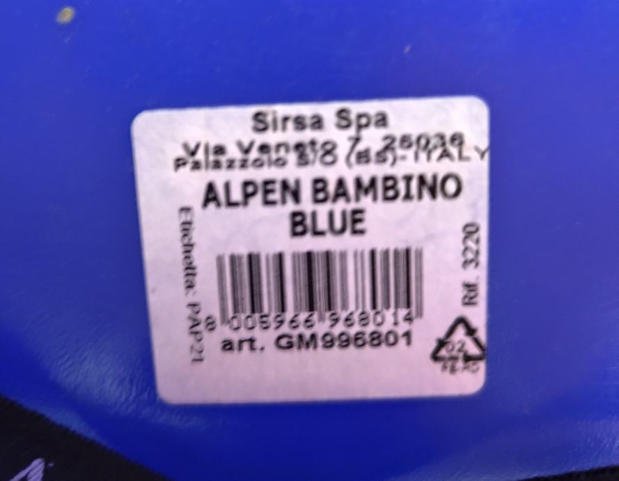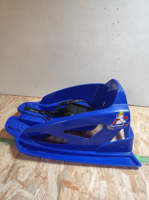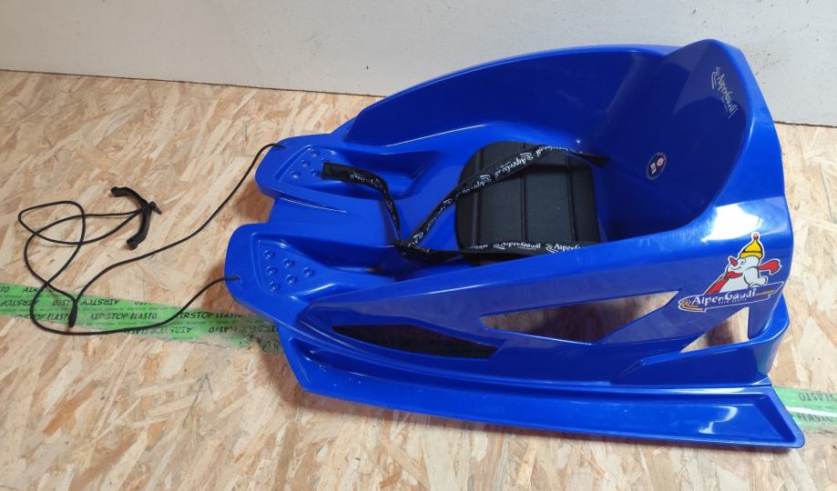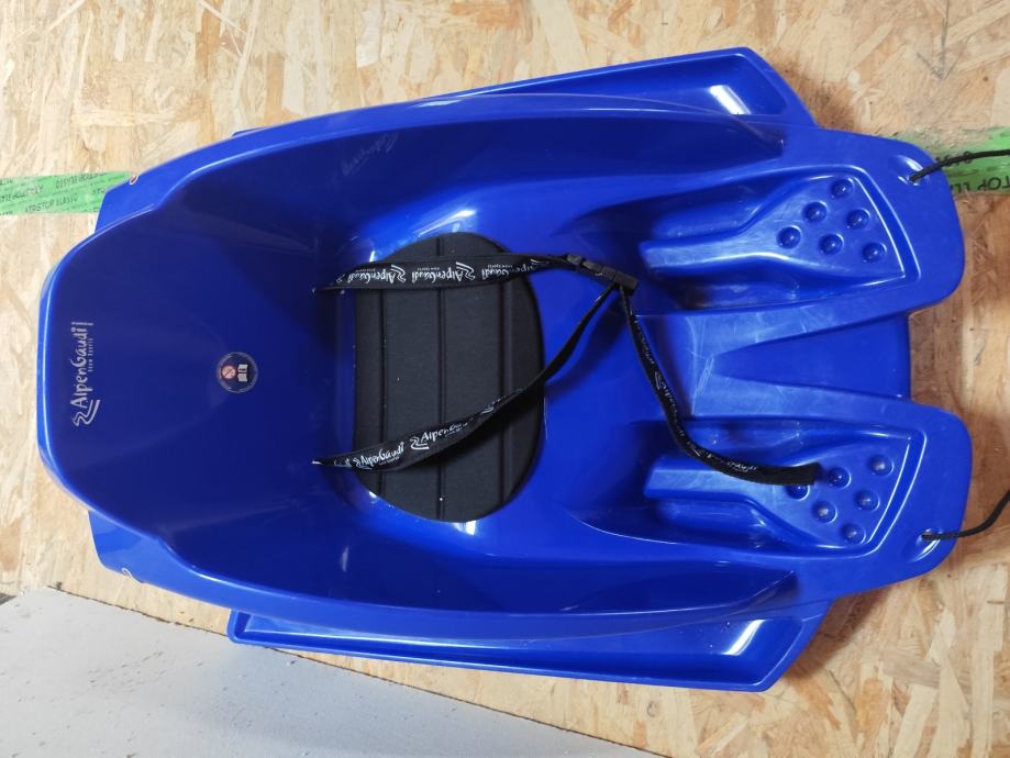 Alpengaudi bob saonice u plavoj boji, s pojasom za pričvršćivanje, za malu djecu od cca. 2-3,5 godine (maksimalna dopuštena težina 20 kg).