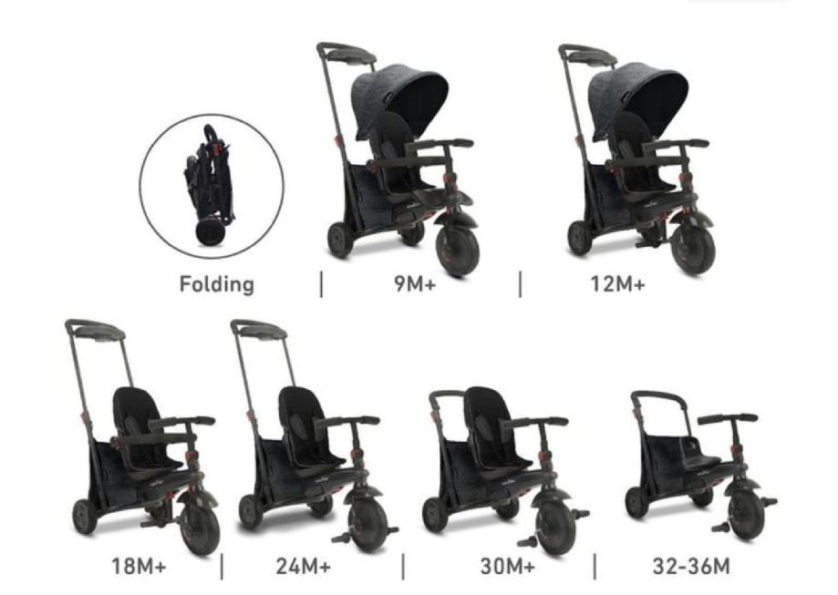 Faza 7 (32-36M +): potiče samostalnost. Preklopite ručicu upravljača, uklonite visoki naslon i sigurnosni pojas. Razvijanje motoričkih sposobnosti samostalnom vožnjom.