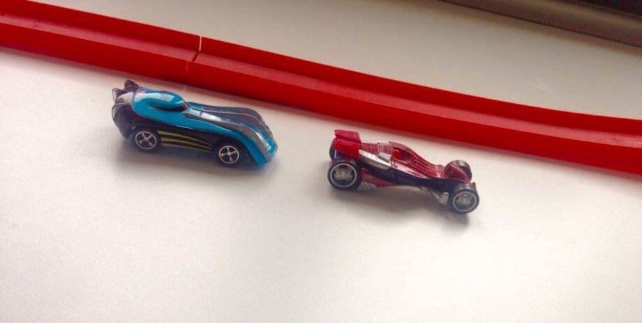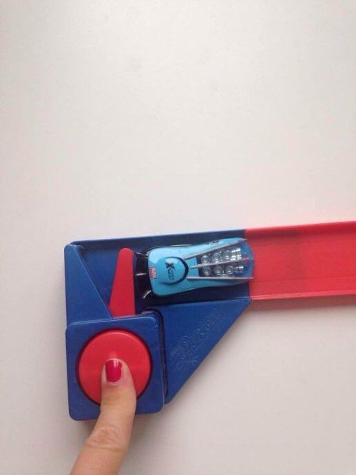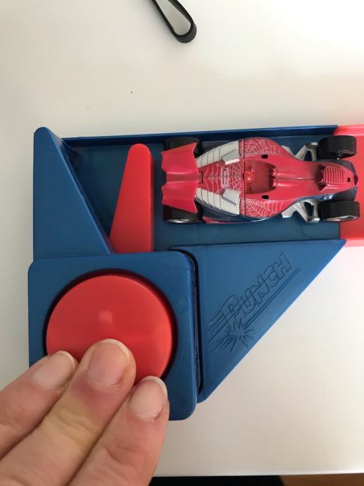 *naglim potiskom na dugme se ispuca autic,koji velikom brzinom juri po rampi i iskoči u vis u jednu od tri rupe na kraju rampe