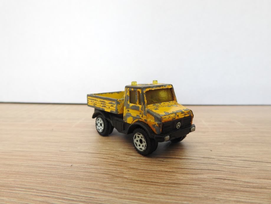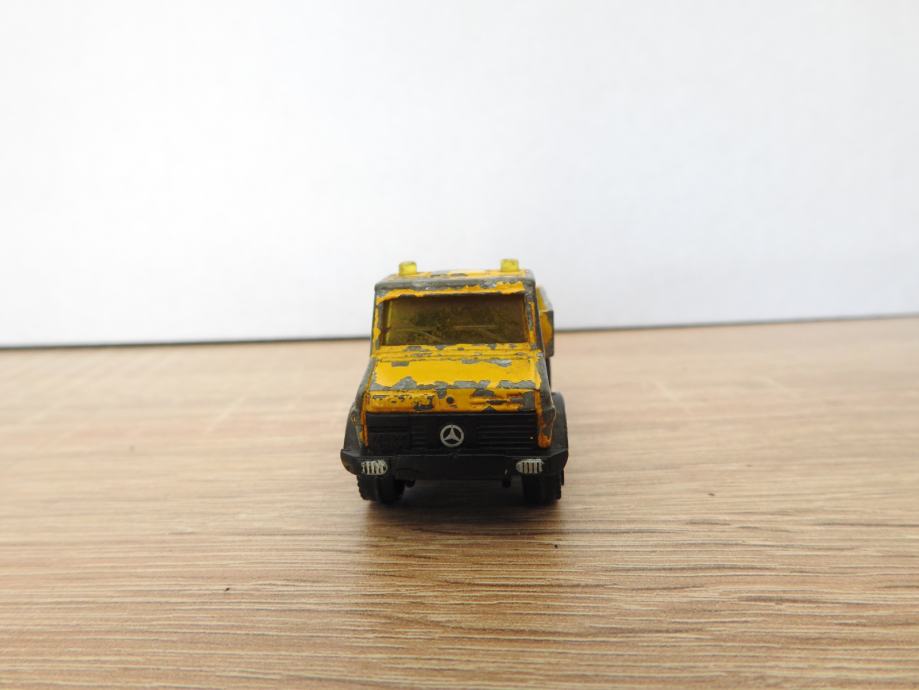 Na prodaju je originalni metalni model Mercedes-Benz Unimog proizvođača Siku, serija Super, mjerilo 1:55. Model je starijeg datuma, vjerovatno iz 80-ih godina, izrađen od metala s plastičnim dijelovima. U pitanju je žuti kamiončić s kiper korpom koja se može podizati.