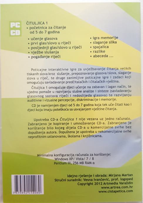 CD Čituljica 1 je edukativni, interaktivni CD za učenje velikih tiskanih slova i čitanja za djecu predškolske dobi i učenike 1. razreda. CD sadrži 11 zabavnih i funkcionalnih vježbi namijenjenih usvajanju vještina početnog čitanja velikih tiskanih slova, te 12 igara pomoću kojih dijete uvježbava čitanje, raspoznavanje slova i glasova, uvježbava memoriju, vizualnu percepciju te uči kroz igru.
