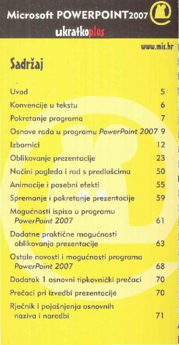 2. Microsoft PowerPoint 2007 ukratko plus (Tomislav Vičić), Miš Zagreb, 2007., str. 76, format: 12x21 cm, spiralni uvez, 4,50 € / 33,95 kn i