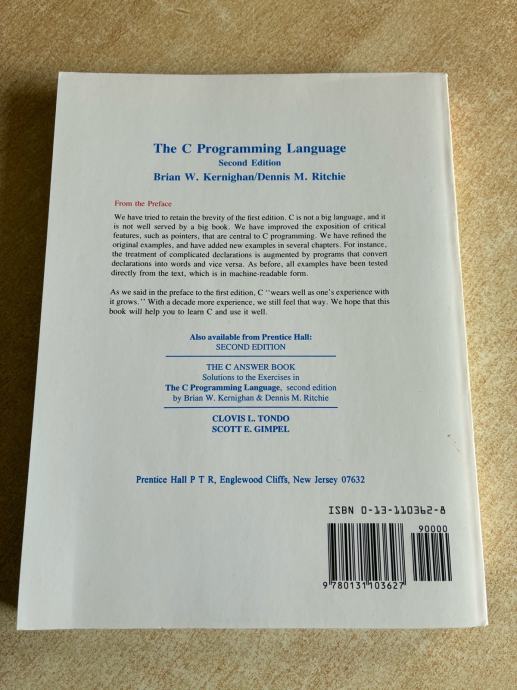 Prodajem novu knjigu The C Programming Language, drugo izdanje, autora Briana W. Kernighana i Dennisa M. Ritchieja. Ovo je jedno od najpoznatijih i najcjenjenijih djela iz područja programiranja, izdano u sklopu Prentice Hall Software Series. Radi se o ANSI C izdanju.