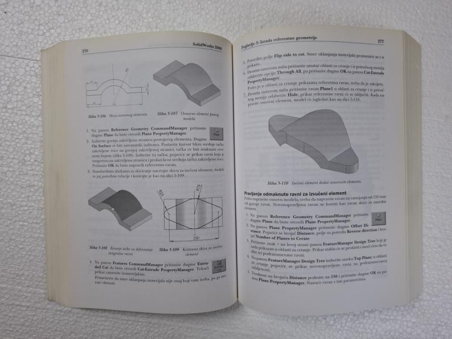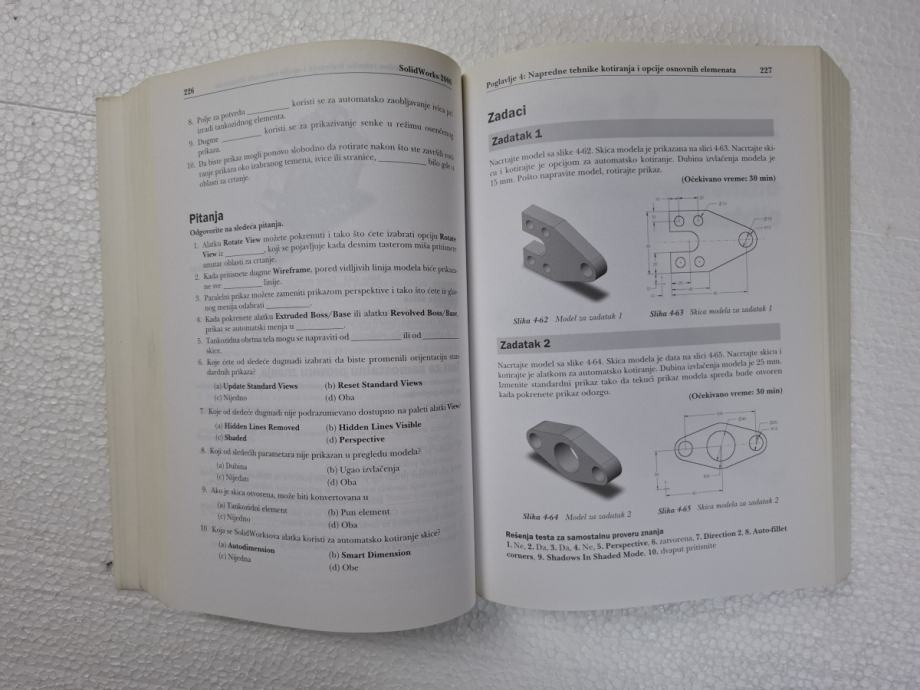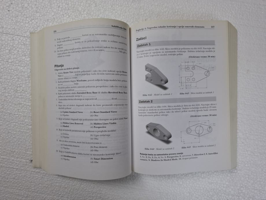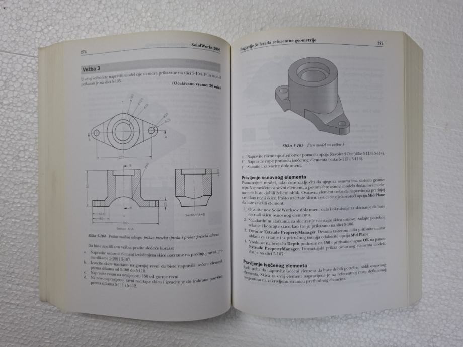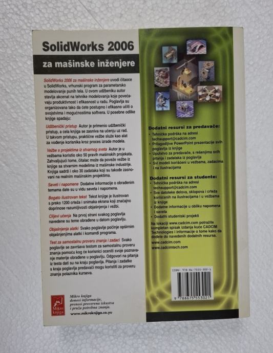 "Obiman i bogato ilustrovan priručnik koji detaljno obrađuje SolidWorks - popularan program za 3D modelovanje. Knjiga je napisana kao priručnik za učenje uz rad, a koriste se primeri iz stvarnog sveta mašinskog projektovanja. Obrađeni su glavni radni režimi programa: Part - projektovanje delova, Assembly - projektovanje sklopova, i Drawing - izrada tehničkih crteža različitih projekcija, preseka i detalja 3D modela.