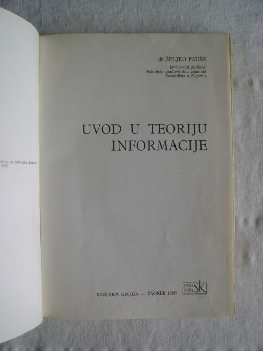 Željko Pauše - Uvod u teoriju informacije - izdavač Školska knjiga, Zagreb 1980. godine, 17 x 24 cm, tvrdi uvez, 143 stranice.