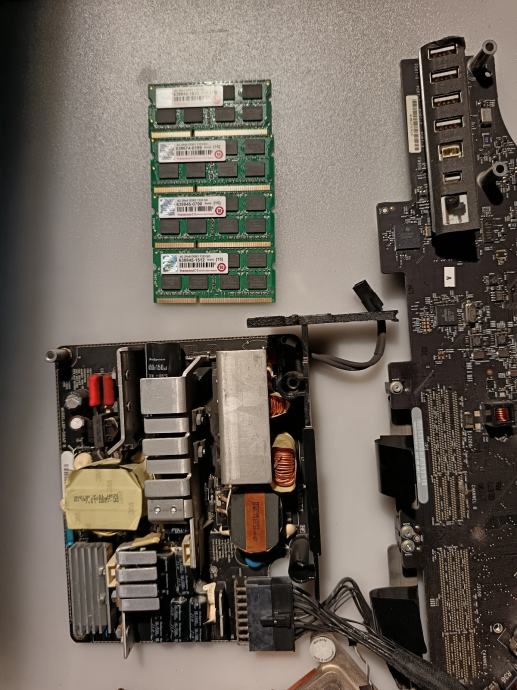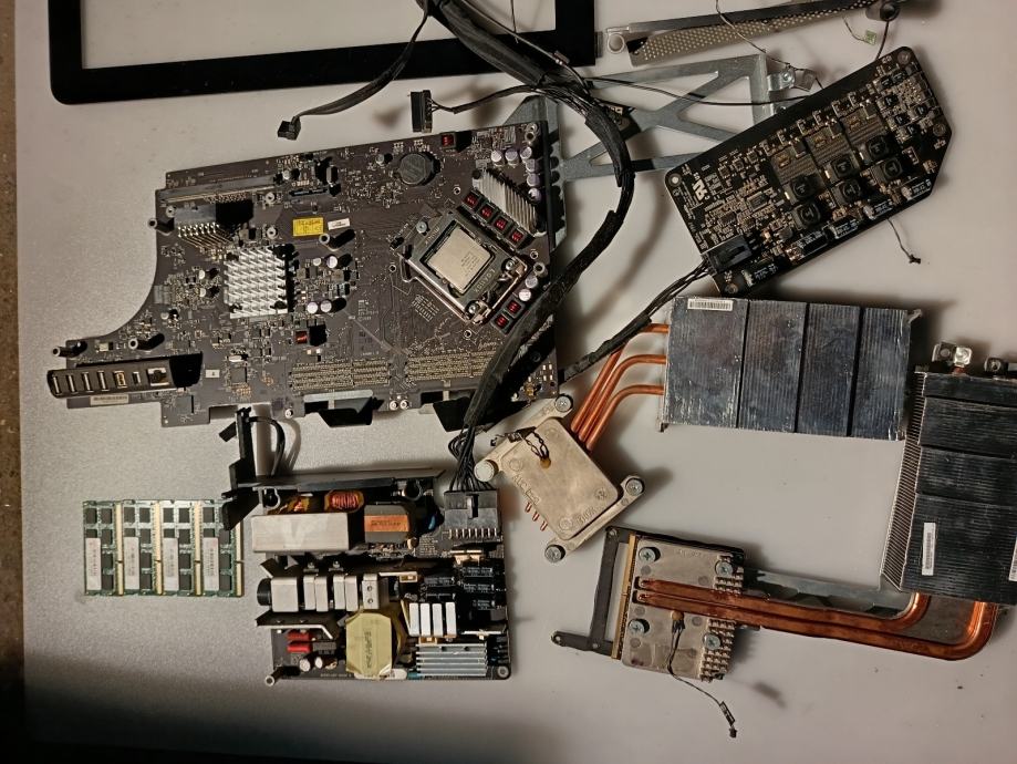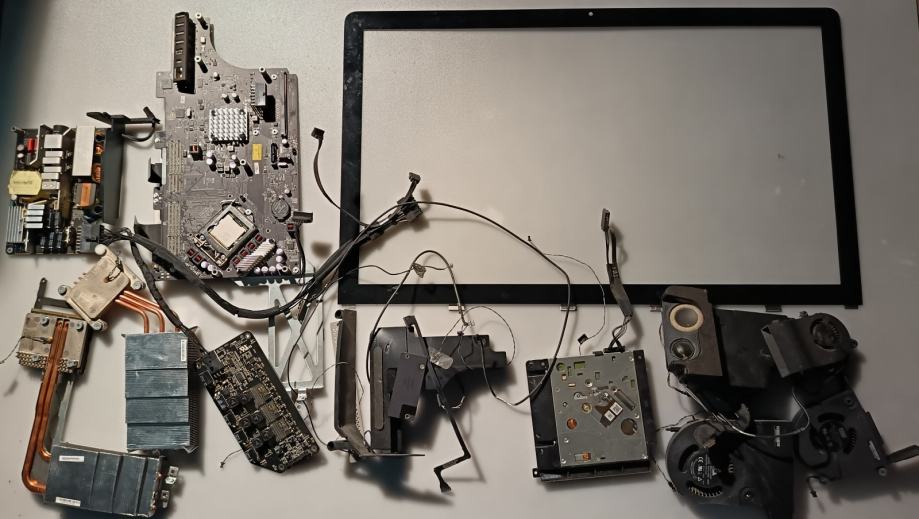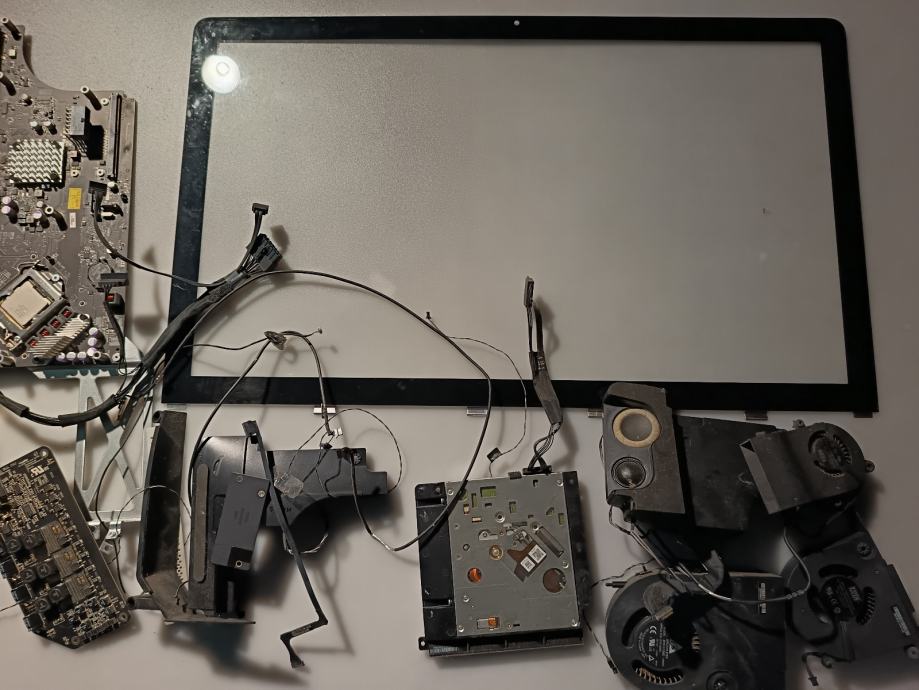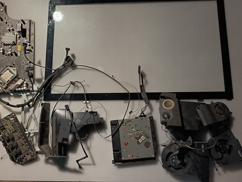 Prodajem dijelove za Apple iMac 27" A1312. Računalo je rastavljeno, a u prodaju idu pojedinačni dijelovi koji su vidljivi: prednja staklenа ploča (bezel), matična ploča, optički čitač, zvučnici, rashladni sustav (hladnjak s ventilatorima), GPU ploča te razni kabeli i konektori.