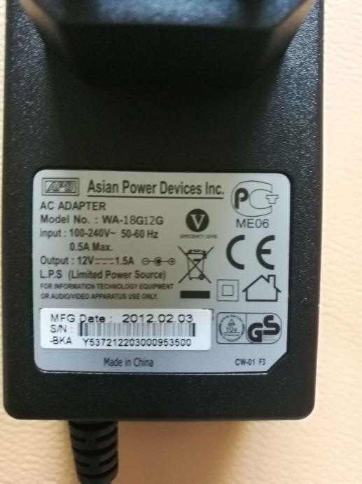 Asian Power Devices Inc. AC adapter model WA-18G12G, 12 V, 1.5 A, u super stanju