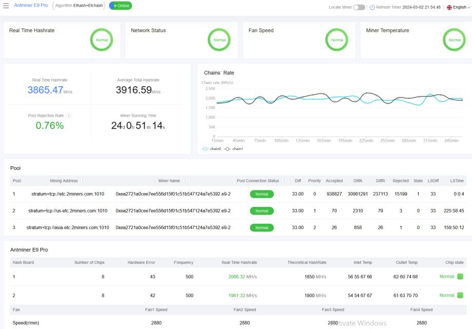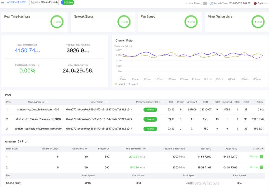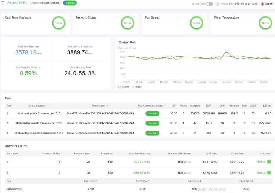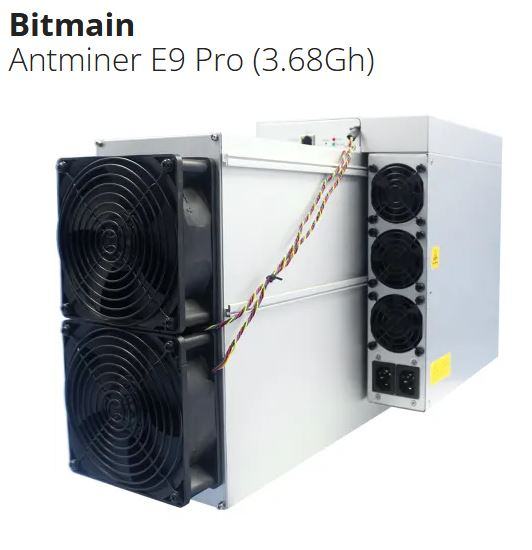 Model Antminer E9 Pro (3.68Gh) from Bitmain mining EtHash algorithm with a maximum hashrate of 3.68Gh/s for a power consumption of 2200W.