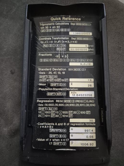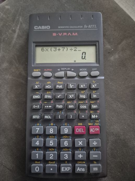 Prodajem Casio fx‑82TL S‑V.P.A.M. znanstveni kalkulator, potpuno ispravan i testiran. Dvoredni LCD zaslon (gore formula, dolje rezultat), idealno za školu i fakultet. Znanstvene funkcije: trigonometrija, logaritmi, potencije, korijeni, razlomci, statistika, 9 memorijskih registara. Radi na jednu AA bateriju, tipke mekane i sve rade.