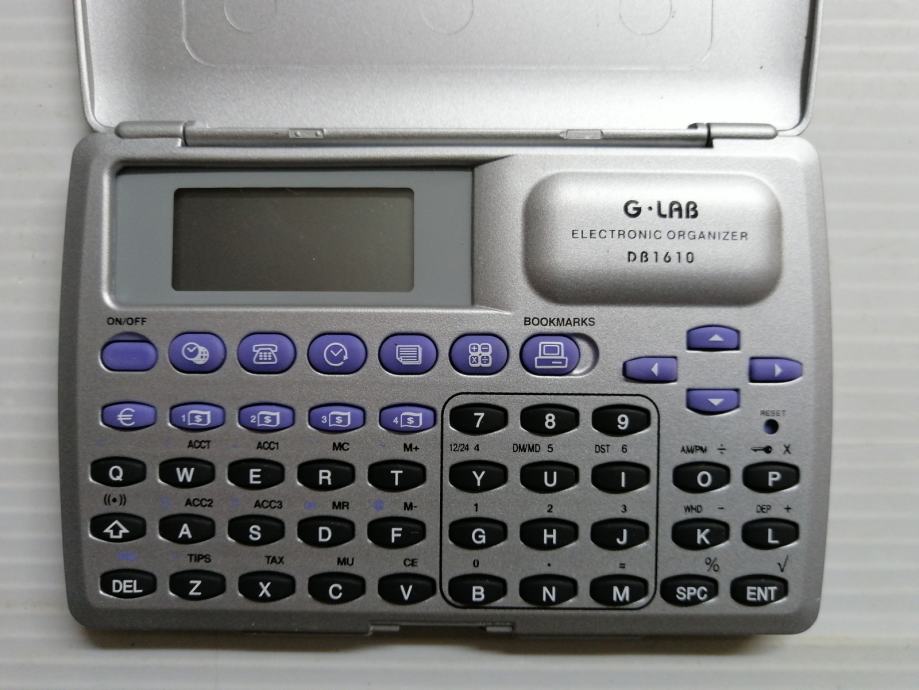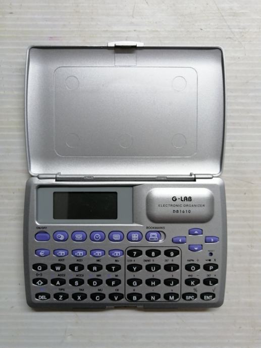 G-LAB elektronski organizator DB1610, memo funkcija, preračunavanje jedinica, telefonski imenik, sedam jezika, To-Do (lista zadača), kalkulator, dnevni alarm, budilica, organizator (sastanci, obaveze...), potrebno staviti bateriju (obična, okrugla kao za zidni sat), original kutija, Hrvatske upute, novo nekorišteno.