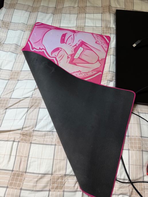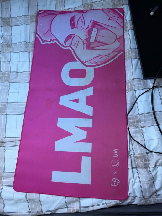 Prodajem Gallasandala podlogu za miš, odnosno gaming podlogu velikih dimenzija (desk pad). Radi se o kolaboraciji GG x UVI s prepoznatljivim dizajnom u roza boji i natpisom "LMAO". Gornja strana je glatka tkanina pogodna za precizno klizanje miša, dok je donja strana od protuklizne gume.