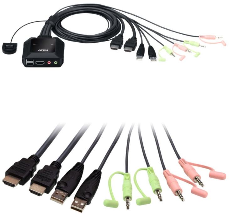 - One USB keyboard, mouse and one HDMI monitor control two HDMI computers