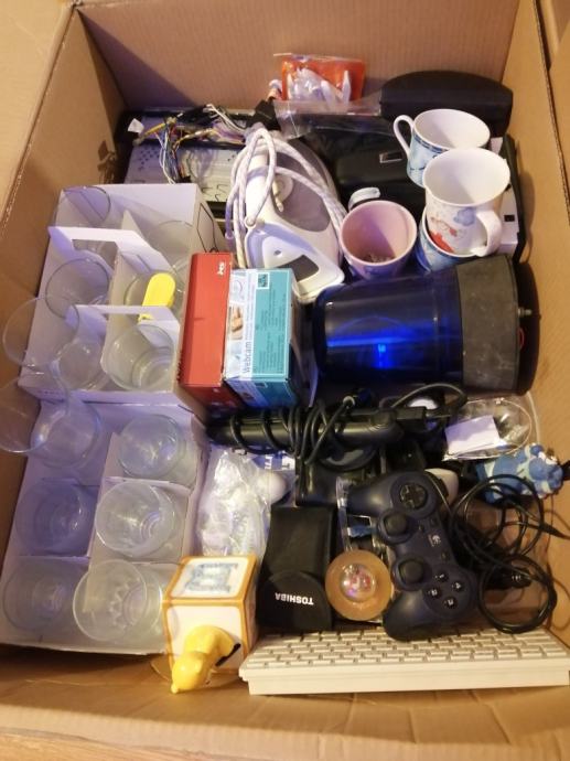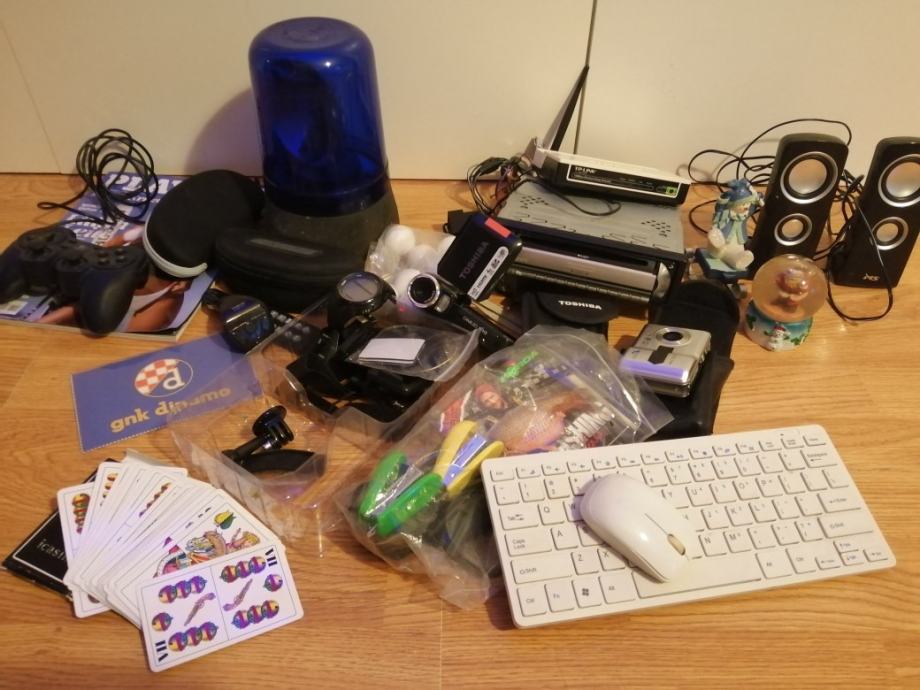 Lot nema cega nemaSVE SA FOTKE! Naocale, pegla za kosu, pegla, case, kalkulatori, kamera, fotici, loptice za stolni nogomet, cd,auto rotirka plava, auto cd radio, sat, nosaci goPRO kamere, e-cigarete+baterije mp3, web kamera,ogledalo, karte za belot, kablovi, bezicna tipkovnica+mis, suveniri,wifi extender ... Itd, itd,itd. Iskljucivo u kutiji kao lot! 99% sve radi!!! Ne pitajte moze li jedna stvar, NE! Samo KOMPLET!!! CIJENA VISE NEGO POVOLJNA.Prodaje se visak iz kuce, pogodno za sajmove, placove, štandove!!!