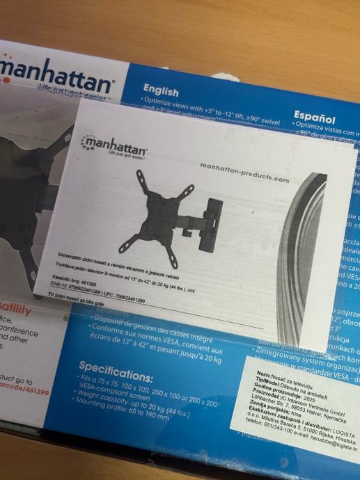 Prodajem Manhattan univerzalni zidni nosac za flat-panel televizore ili monitore. Nosač je potpuno nov, nikada montiran, u originalnom pakiranju sa svim pripadajućim vijcima i tiplama (vidljivo na slikama).