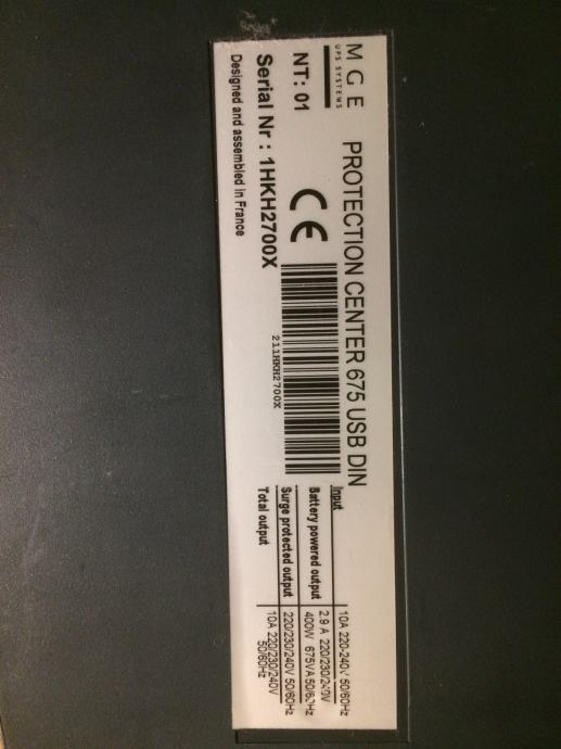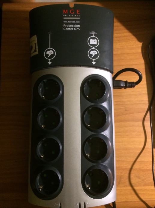 Kućna zaštita uređaja u strujnoj mreži. 8 utičnica plus internet i telefon ulazi. 4 lijeve utičnice ispravne (udar groma), 4 desne utičnice ne rade (udar groma/napajanje pri nestanku struje). Potrebna izmjena baterije.