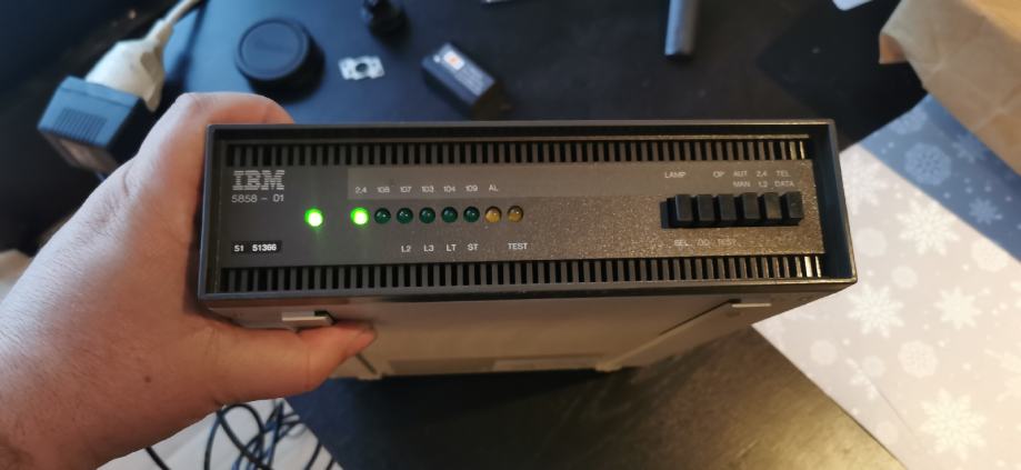 Na prodaju je rijetki IBM 5858 modem iz 1991. godine, namijenjen za upotrebu u kućama i malim uredima. Modem je u dobrom stanju i uključuje se s originalnim adapterom. Reagira na pritisak gumba i čini se da ispravno funkcionira, iako nije dalje testiran.
