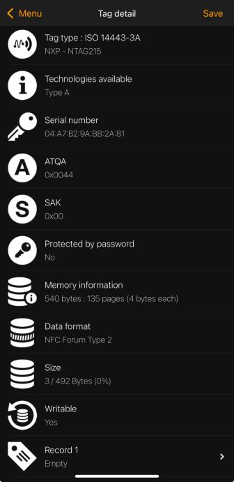 4. NFC prazna oznaka koristi NTAG 215 čip s 504 bajta memorije i može se čitati i pisati više od 100.000 puta.