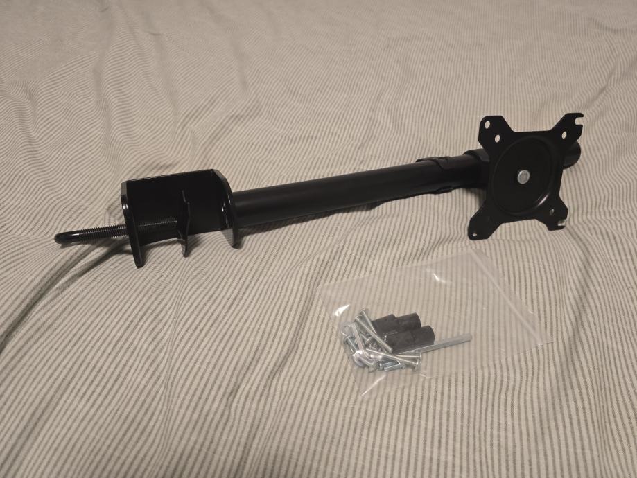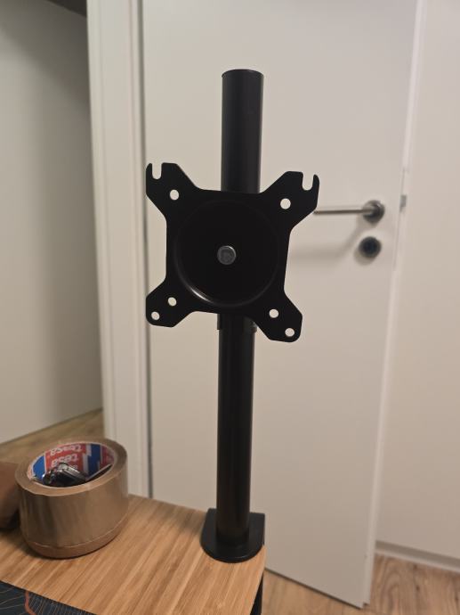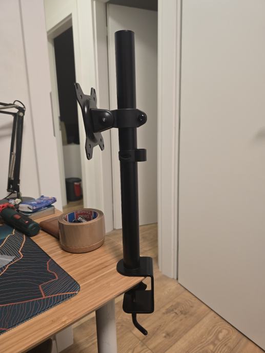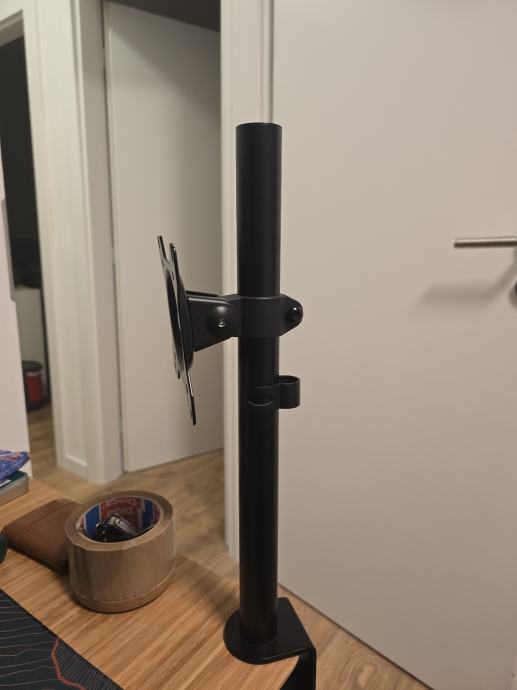 Prodajem rabljeni nosač za monitor u crnoj boji. Radi se o stolnom nosaču s vertikalnim stupom koji se montira stezaljkom na rub stola. Nosač omogućuje podešavanje visine i nagiba monitora, a glava nosača ima standardni VESA utor za pričvršćivanje. Konstrukcija je stabilna i čvrsta.
