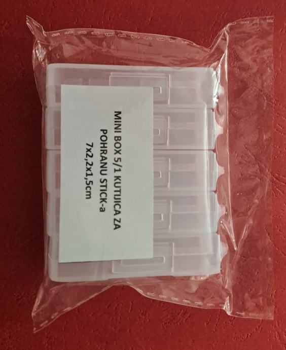 Prodajem set od 5 mini plastičnih kutijica za pohranu USB stickova. Dimenzije jedne kutijice su 7 x 4.2 x 1.5 cm. Kutijice su prozirne, praktične i nove, zapakirane u originalnu vrećicu.