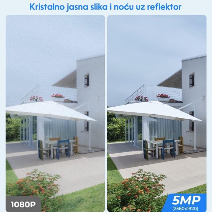 Uživajte u oštrim i jasnim snimkama zahvaljujući SuperHD (2560 x 1920px) rezoluciji. Kamera ima napredni CMOS senzor koji osigurava kvalitetnu sliku i pri slabom osvjetljenju (do 10 metara). Ugrađeni reflektor omogućuje noćno snimanje u boji, a aktivira se pri detekciji pokreta.