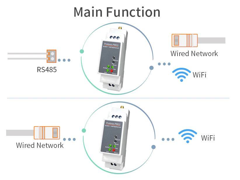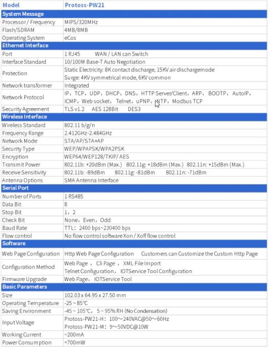 Protoss poslužiteljski modul PW21-M verzija DC9-48V ili verzija PW21H na AC 230V pruža kontrolu RS485 sučelja putem Etherneta ili Wi-Fi veze na Internet IP protokol bilo kojeg uređaja. Protoss PW21 integrira TCP / IP kontroler, memoriju, 10 / 100M Ethernet emitiranje, brzi serijski port i integrira potpuno razvijenu TCP / IP i eCos OS mrežnu kompatibilnost. Protoss PW21 također uključuje ugrađeni web poslužitelj koji se koristi za daljinsko konfiguriranje, praćenje ili rješavanje problema na povezanom uređaju.
