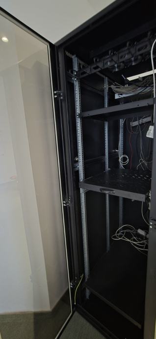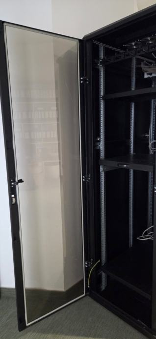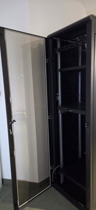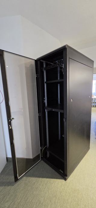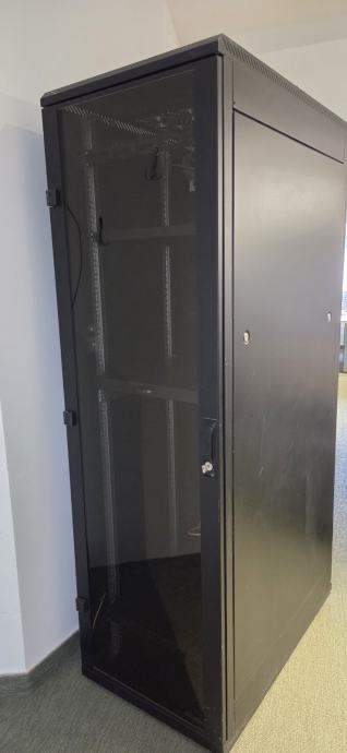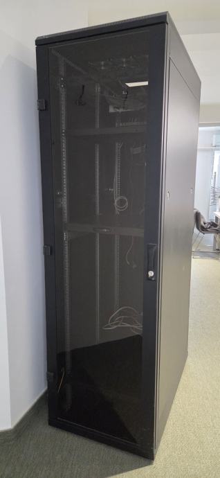 Triton 42U/600x1000x2000, RMA-42-A61-BAXA1, crni. Ima staklena vrata koja se mogu zaključati, 2 police i ventilacijsku jedinicu sa 6 ventilatora. Visina 200cm, dubina 100cm, širina 60 cm.