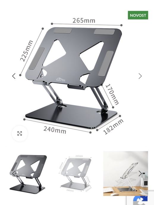 Kompaktne dimenzije stalka od 265 x 225 x 50 mm u sklopljenom stanju čine ga izuzetno praktičnim za skladištenje i transport. Njegova težina od 1,2 kg dodatno pojednostavljuje prenosivost.