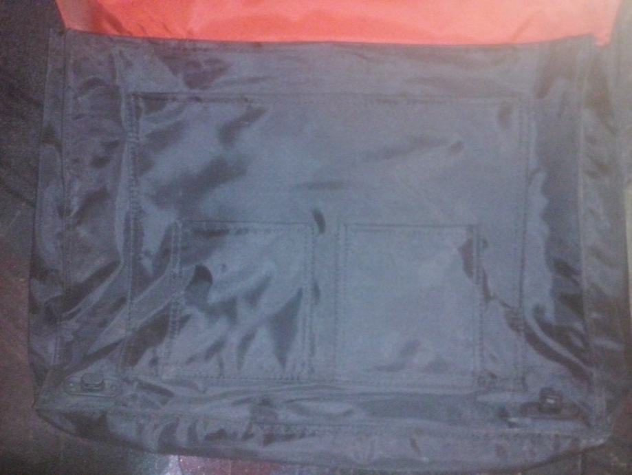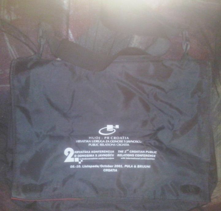 Torba za laptop dimenzija 38x30 cm, crno-crvena.Iznutra dio za laptop te još jedan manji pretinac cca 28x20 cm i još dva džepa cca 10x11 cm. Regulirajući remen za rame. Dosta rabljena, ali u dobrom stanju, na crvenom unutrašnjem dijelu otisak od grafita jer su stajali dokumenti (nije jako primijetno). Logo Hrvatske udruge za odnose s javnošću i konferencije.