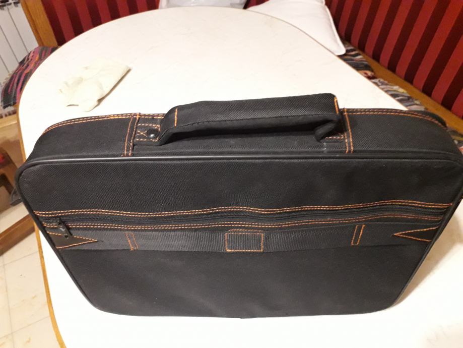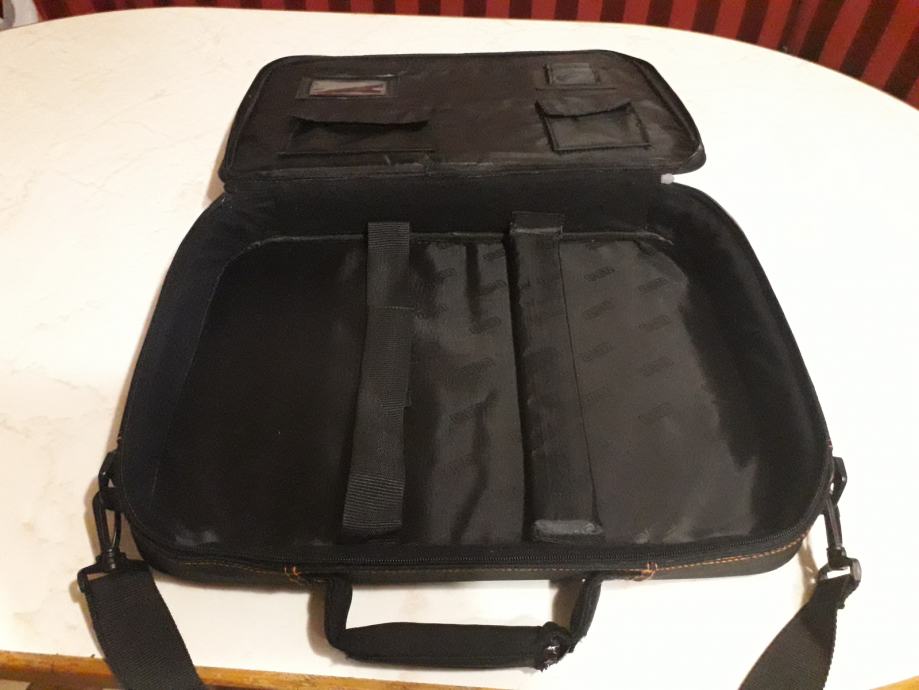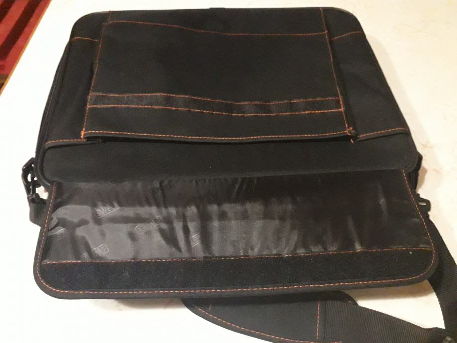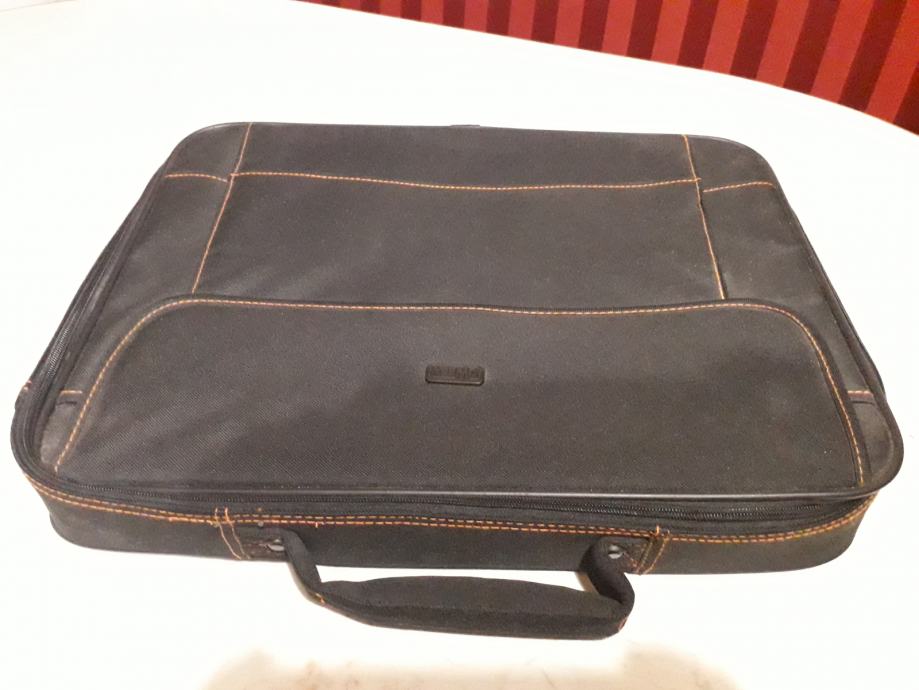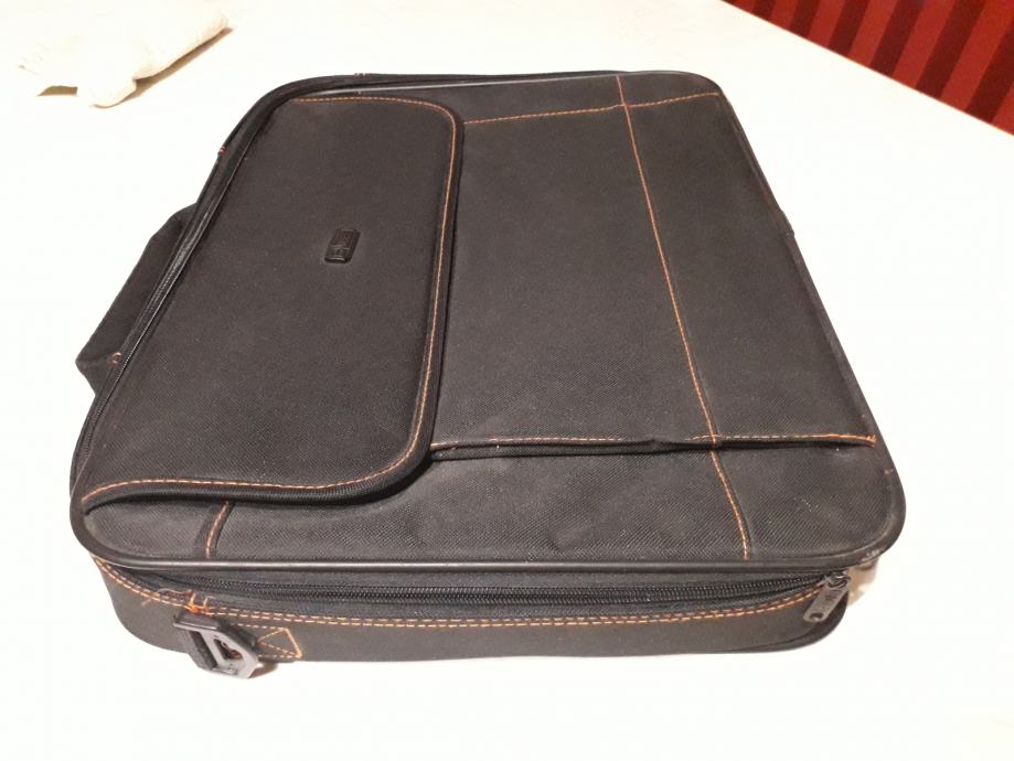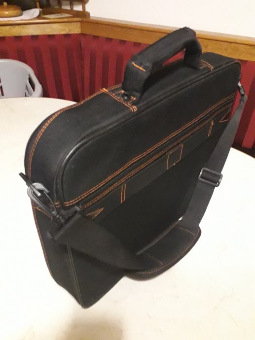 Torba je cvrsta, samostojeca, dimenzije š 48 cm, v 37 cm, d 7,5 cm. Ima podesivu naramenicu koja se moze maknuti. Jedan je pretinac s prednje strane, jedan sa straznje strane i jedan dodatni unutra. Moze se otkopcati s tri strane. U odlicnom stanju, bez ostecenja, zatvaraci ispravni.