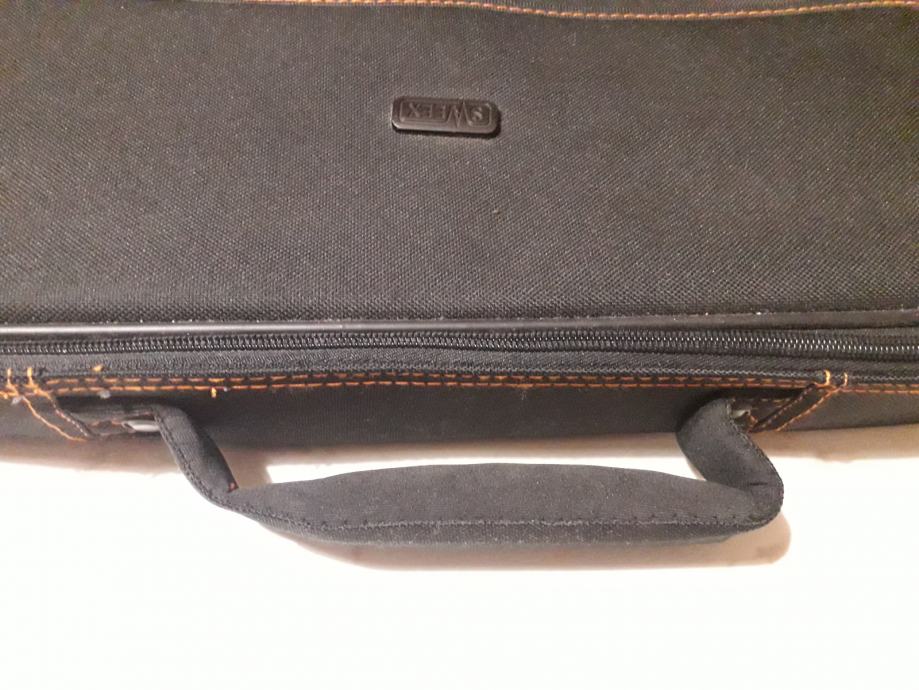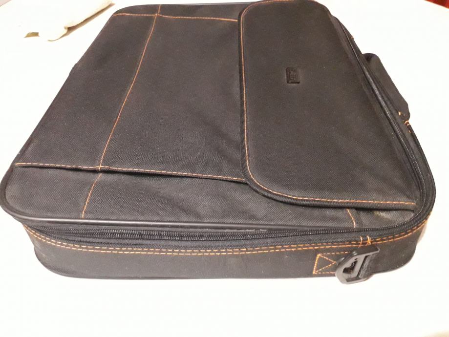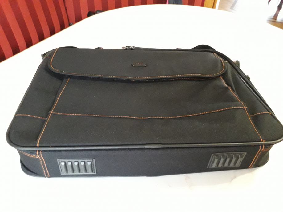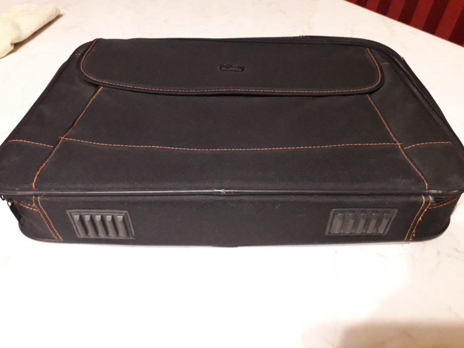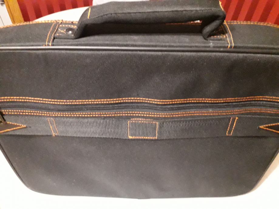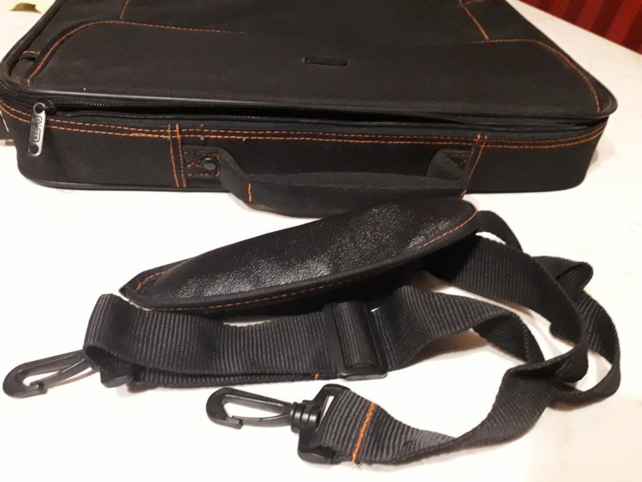 Torba je cvrsta, samostojeca, dimenzije š 48 cm, v 37 cm, d 7,5 cm. Ima podesivu naramenicu koja se moze maknuti. Jedan je pretinac s prednje strane, jedan sa straznje strane i jedan dodatni unutra. Moze se otkopcati s tri strane. U odlicnom stanju, bez ostecenja, zatvaraci ispravni.