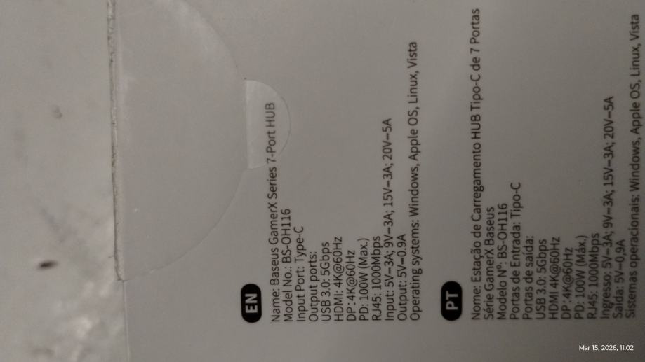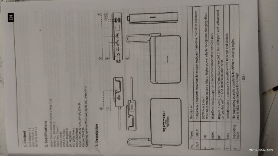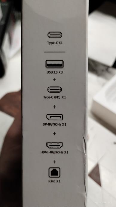 Na hubu se nalazi nekoliko priključaka: DisplayPort, HDMI, RJ45 (LAN) ethernet priključak, USB-A priključci te Type-C priključak za napajanje. Kućište je u tamno sivoj/crnoj boji.