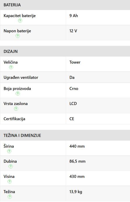 Green Cell UPS13. Topologija besprekidnog napajanja: Dvostruka pretvorba (na mreži), Kapacitet izlazne snage (VA): 1,999 kVA, Izlazna snaga: 900 W. Broj AC izlaznih utičnica: 6 utičnice naizmjenične struje, Tip USB ulaza: USB Tip-B. Kapacitet baterije: 9 Ah, Napon baterije: 12 V. Veličina: Tower, Boja proizvoda: Crno, Vrsta zaslona: LCD. Širina: 440 mm, Dubina: 86,5 mm, Visina: 430 mm