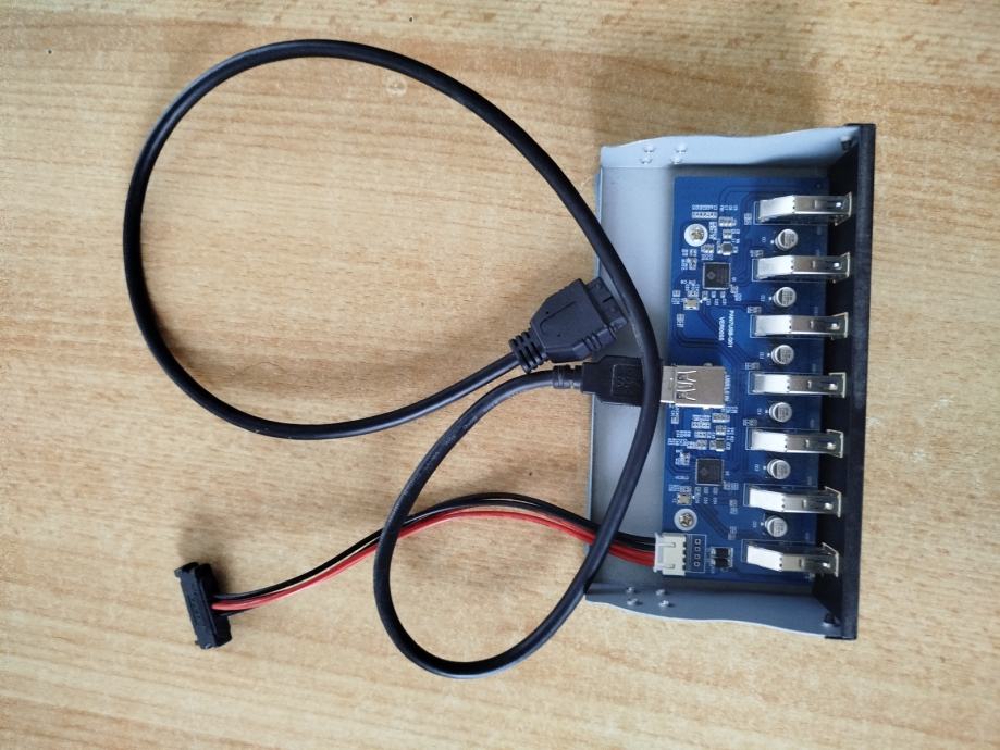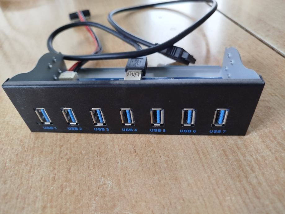 Ladica sa sedam usb priključaka. Spaja se na matičnu ploču. Dimenzije standardne za ugradnju u kućište s prednje strane. Prodajem jer mi više ne treba.