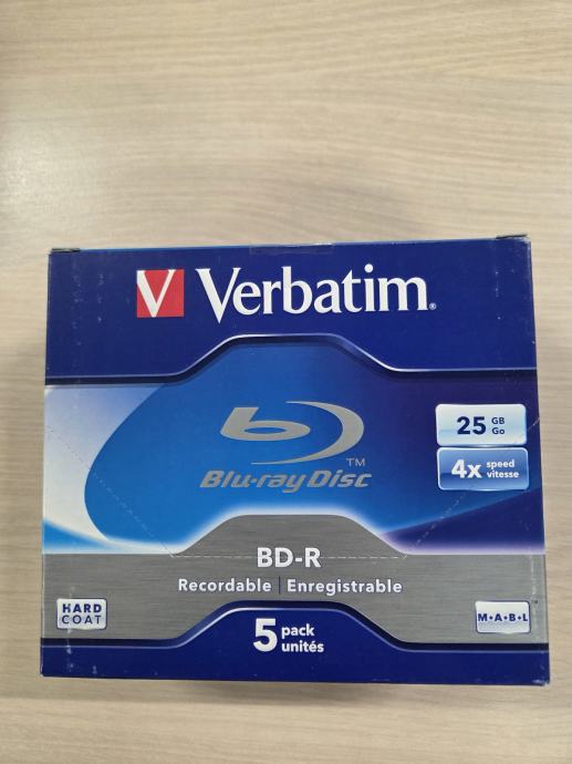 Prodajem novi Verbatim BD-R Blu-ray paket od 5 diskova, kapaciteta 25 GB po disku i brzine snimanja 4x. Diskovi su s Hard Coat zaštitom površine.