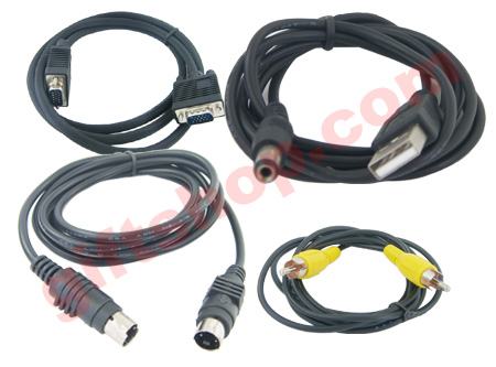 s njim se dobiju i svi kablovi koji su po mojoj subjektivnoj procjeni sasvim dovoljni za prikaz bilo cega na obicnom crt TV-u(barem mom od 55cm) koji su svaki duzine cca 1m(usb power, vga, s-video, chich)...