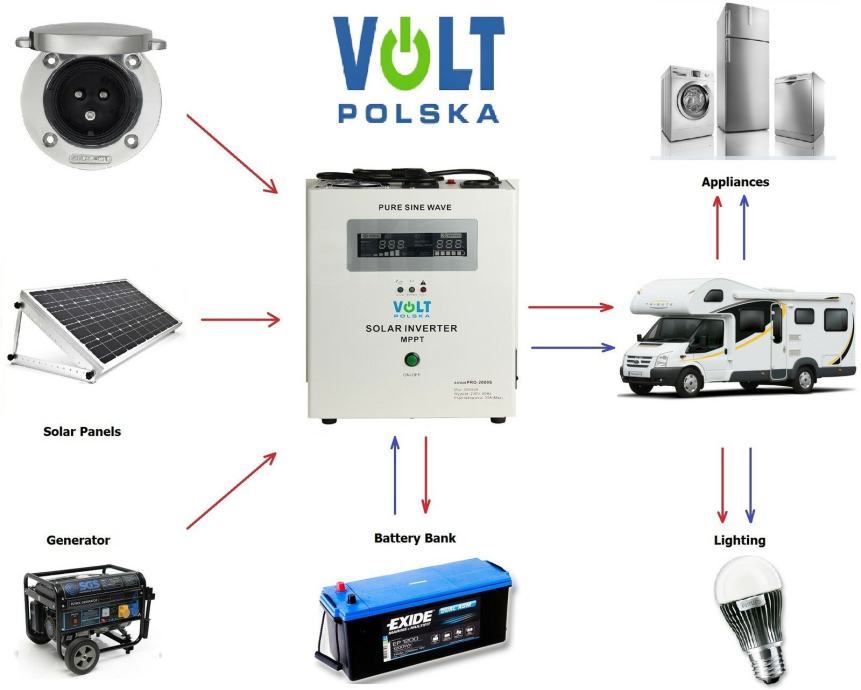 U jednom slučaju s prikazom u boji nalaze se automatski regulatori napona AVR mreže, solarni punjači 30Aprostownik MPPT, čisti sinusni pretvarač zasnovan na toroidnom transformatoru koji kompenzira različite prijemnike jalove snage (može povezati kapacitivna opterećenja, induktivna i omička) i vrlo fleksibilan odgovor preopterećenje (pokretanje crpki, kompresora, motora). Pretvarač može raditi u UPS-u koji pruža kontinuirane i besprijekorne ventilatore, hranilice, pumpe itd.