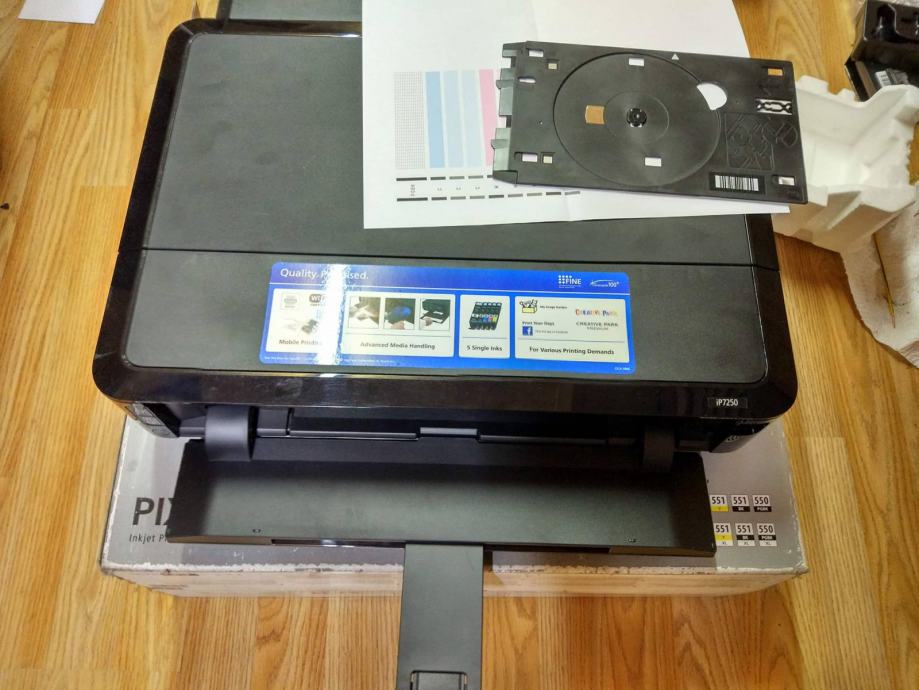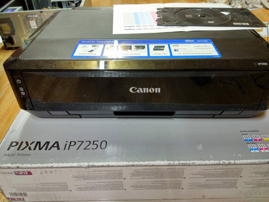 Prodajem inkjet printer canon pixma ip 7250, print na CD-e, wi-fi, kvalitetni foto ispis, print fotografija A4, star 2 godine. Ima otpr 500 otisaka s prvim originalnim tintama koje su se istrosile, ostala je jedino deblja crna, slika stanja je u privitku. Glava nije začepljena i uredno ispisuje, printer samo treba nove boje. Može dostava ZG, Cijena 300 kn.