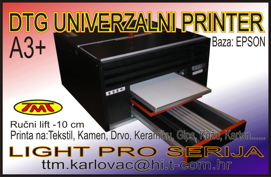 Novi model printera LIGHT PRO A3+ ima: stabilnu osnovnu metalnu šasiju, remenski pogon za tihi, stabilni i precizni rad, manje fizičke dimenzije kutije, elektronsko upravljanje pomičnim stolom, automatski print tamnih majici sa posebnim sistemom za upotrebu bijele boje, te ručnim liftom do 10 cm. Printer je jednostavan za upotrebu i održavanje te se u kompletu dobije sa svim potrebnim uputama ( HR ), priborom i originalnim , najnovijim RIP softverom, koji je neizostavan za rad sa ovakvim printerima. Za uređaj su osigurani svi rezervni dijelovi ( glave, matične ploče, softver, kablovi...)kao i stalni servis i podrška u radu, uključujući i boju za tisak te predtretmane za svijetle i tamne majice.Printeri se uglavnom rade po narudžbi te su zbog svojih mogućnosti pogodni za razne suvenirnice, tiskare, gift shopove i sl....