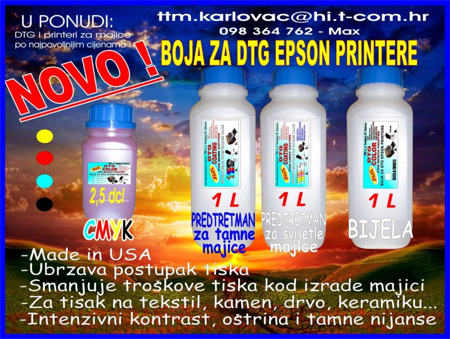 ISPORUKA ODMAH ! Osmogodišnje iskustvo u izradi DTG i printera za majice, omogućilo nam je da razvijemo LIGHT PRO MODEL printera za majice i sl, predmete, te za izradu raznih suvenira ( poput magnetića i sl.....) od prirodnih materijala kao što su : drvo, kamen, neglazirana keramika, koža, karton, gips, slikarsko platno i sl. upijajući materijali .Na sve navedene materijale printate direktno bez ikakvog predtretmana! Printer je prilagođen većini zahtijeva kupaca, sa boljim teh. karakteristikama i kvalitetom, te cijenom prilagođenom domaćem tržištu.