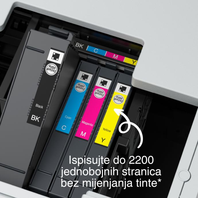 Ovaj visokokvalitetni višenamjenski pisač omogućuje vam da budete ambiciozni nudeći jednostrani i obostrani ispis, skeniranje i faksiranje do formata A4. Lako ćete obavljati zadatke uz brzinu ispisa do 25 str./min¹ pri crno-bijelom ispisu i automatski posluživač listova (ADF) kapaciteta 50 stranica formata A4. Pritom valja imati na umu i cjenovno pristupačne tinte i fleksibilna rješenja bežične spojivosti kao što je Scan-to-Cloud².