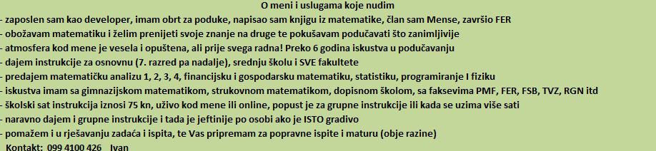 Doktorand matematike, sa višegodišnjim iskustvom u podučavanju, daje instrukcije iz matematike, fizike, statistike i programiranja za osnovnu školu (od 7. razreda pa nadalje jer tu kreću problemi), za SVE srednje škole i SVE fakultete.