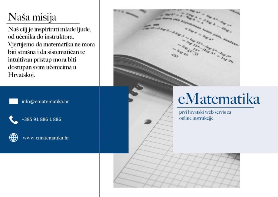 eMatematika je prva hrvatska inovativna platforma za online instrukcije iz matematike, fizike, kemije i informatike koja spaja vrhunsko obrazovanje s modernom tehnologijom. 130+ izvrsno ocijenjenih instruktora, 25 000+ odrađenih sati i 1700+ recenzija uz prosječnu ocjenu 4,97 (5) trenutno jamči vam najbolju uslugu privatnih online instrukcija u regiji. Radimo i s klijentima iz EU. Svaki instruktor ima mali profil i ocjenu klijenata kako bi roditelji i učenici mogli lakše odabrati instruktora ako žele birati. Najčešće usluge koje isporučujemo su online instrukcije no nekim učenicima dovoljna su rješenja zadataka uz postupak s video pojašnjenjem ili samo rješenja i postupak. Također radimo i individualne online pripreme za državnu maturu iz matematike. Više o nama na https://ematematika.hr/ .