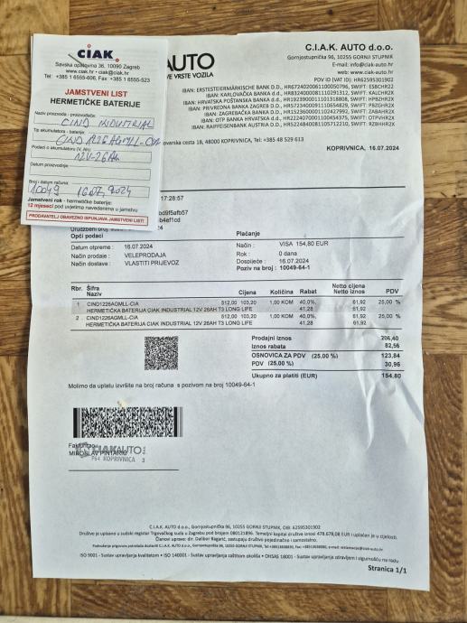 GARANCIJA NA BATERIJE GODINU DANA ( RAČUN U PRILOGU )