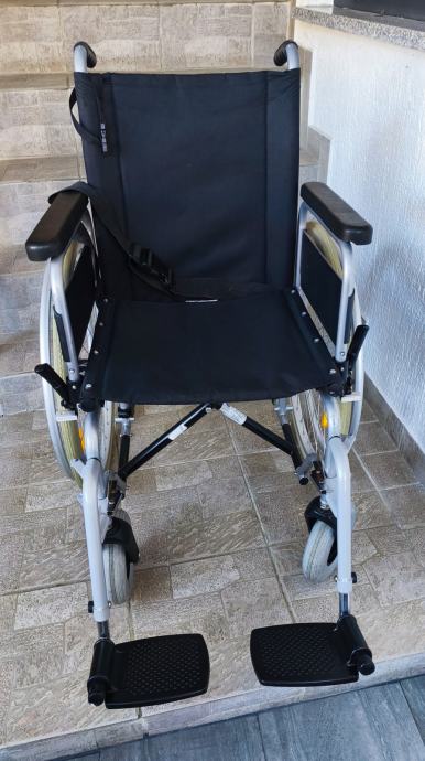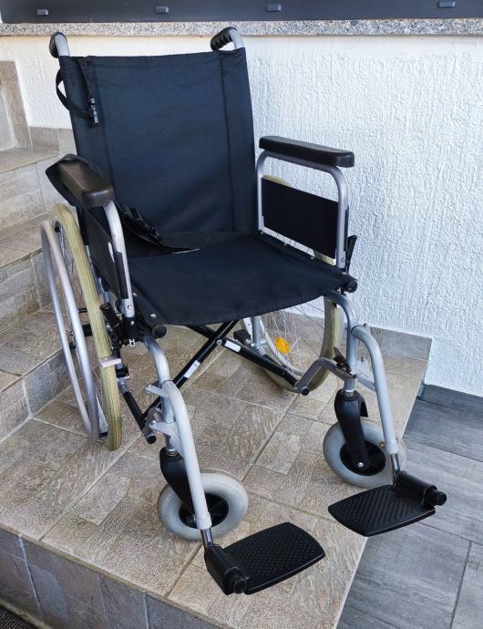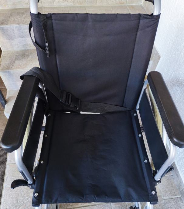 Kolica su lako sklopova širina sjedala 43 cm, ukupna širina 65 cm, nosivost do 120 kg, otklon bočnih stranica, skidanje zadnjih kotača jednim klikom, pune gume , kočnice, pojas......