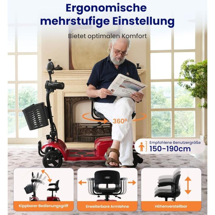 Sjedalo ovog skutera može se podesiti na tri visine i okretati za 360°, što omogućuje jednostavan ulazak i izlazak. Također, nasloni za ruke imaju mogućnost produžetka i osiguravaju udoban položaj ruku tijekom vožnje. S mekano presvučenim naslonima i sjedalom, skuter pruža vrhunsku udobnost i potporu.